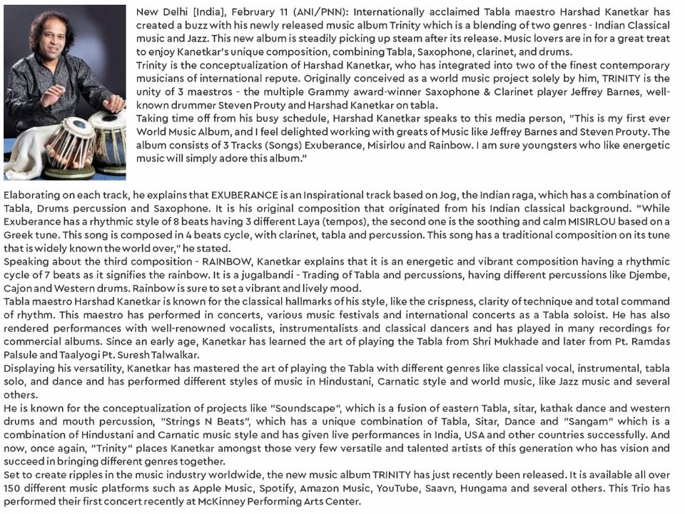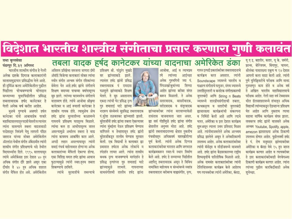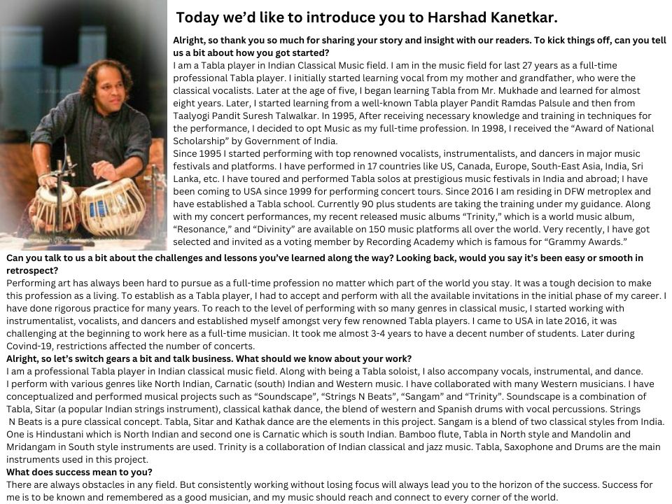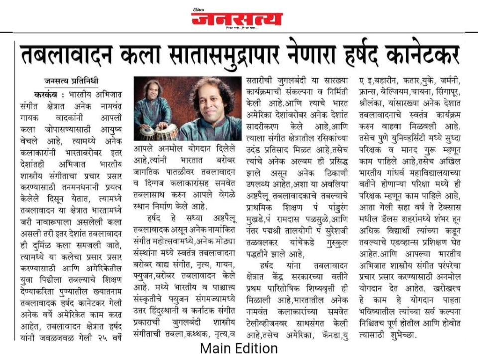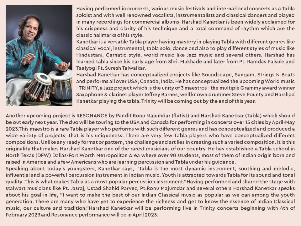 Harshad Kanetkar, eminent Tabla player from India known around the globe for his versatility as a soloist and performer with different genres and different styles of music.
